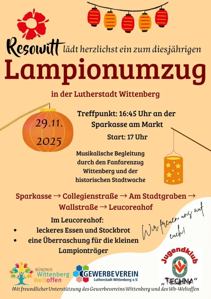 Auch in diesem Jahr lädt Reso-Witt zum öffentlichen und traditionellen Lampionumzug durch Wittenbergs Innenstadt ein. Wie immer am Samstag vorm ersten Advent, in diesem Jahr der 29.11., starten wir an der Sparkasse Wittenberg und damit am Weihnachtsmarkt um 17 Uhr zum Leucoreahof, wo es bei Musik und Lagerfeuer Snacks, Knüppelkuchen, warme Getränke und kleine Überraschungen für die Lampionträger gibt. Es wird also wieder weihnachtlich gemütlich.